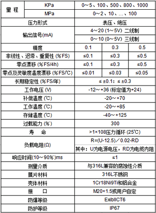 压力变送器采用进口带316L不锈钢隔离膜片的高准确度、高稳定性扩散硅芯片,采用优质的变送电路进行处理,并输出工业标准的4…20mA或0…10mA信号。