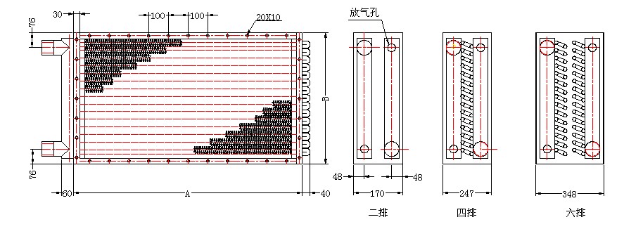 1、表中表示的散热面积均为二排结构,其余四排、六排结构的散热面积分别×2、×3即得;